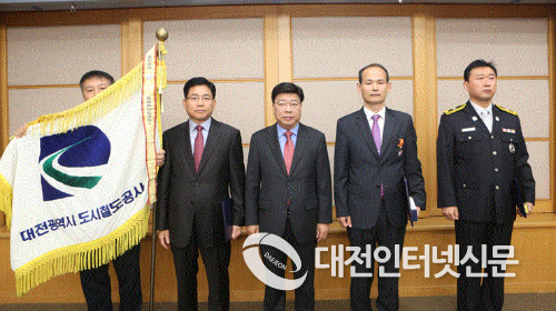 | ▲ 8일 대전도시철도공사(사장 김민기)가 권선택시장으로부터 재난관리평가 대통령상을 전수받고 기념촬영을 하고 있다.(왼쪽 두 번째 공사 김민기 사장, 가운데 대전시 권선택 시장)사진제공-대전도시철도공사 |