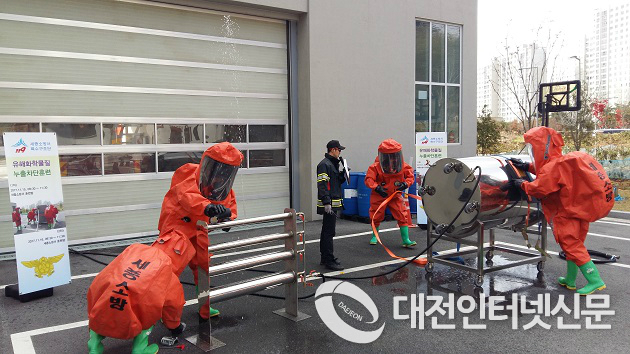 세종특별자치시 세종소방서(서장 임동권)는 15~16일 소방서 훈련탑 앞에서 특수구조단 구조대원을 대상으로 유해화학물질 누출차단 훈련을 가졌다.