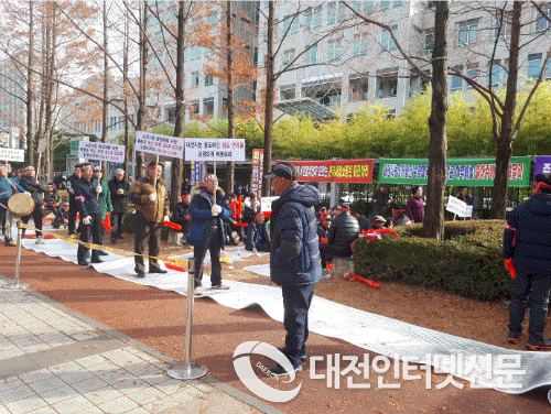 ▲ 노은 중도매인들이 29일 대전시청앞에서 노은시장 활성화을 위해 축협과 축산관련 30개점포 입점,중도매인 점포면적 공평배분, 건축물보수들을 외치며 피캐팅 시위와 농성을 벌였다. 이날 노은 주민자치위원장은 "현재 노은시장에 죽산물 점포가 한곳밖에 없어서 이곳을 찾는 시민들이 불편을 겪고 있다"고 말했다.사진제공-박향선기자