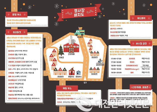 또한 관내 대학생 버스킹 동아리들이 선사하는 감미로운 캐롤 공연과 세종시 청년 메이커스들이 참여하는 `크리스마스 가렌더 만들기´ 등 즉석 체험부스가 함께 운영되어 다양한 먹거리와 볼거리, 즐길 거리를 선사할 예정이다.
