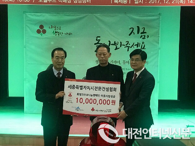 세종특별자치시 전문건설협회(회장 김선태)는 21일 연말연시를 맞아 세종사회복지공동모금회 희망나눔캠페인 행사에서 조치원읍 지역사회보장협의체에 1,000만원을 지정 기탁했다.