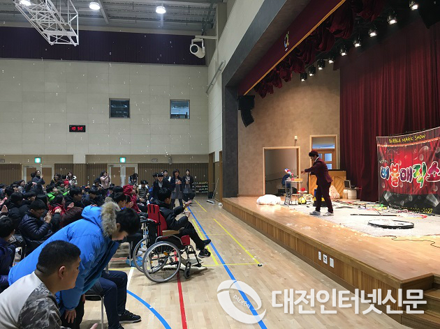 ▲ 세종시교육청이 특수교육대상학생을 대상으로 `2017 찾아가는 예술교실, 크리스마스 산타 버블쇼´를 진행했다. 사진은 21일(목) 세종누리학교에서 진행된 행사 장면(사진-세종시교육청)