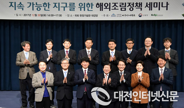 26일 국회 헌정기념관에서 해외산림자원 개발 활성화 방안과 정책방향을 모색하기 위해 열린 `지속 가능한 지구를 위한 해외조림 정책세미나`에서 김재현 산림청장(앞줄 왼쪽 두번째), 박완주 국회의원(앞줄 왼쪽 세번째) 등 주요 참석자들이 기념촬영을 하고 있다.<사진=산림청 제공>