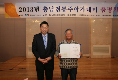 충남발전연구원(원장 강현수, 이하 충발연`)이 개최한 “2013년도 충남전통주아카데미 품평회”에서 박정련(65, 충남 아산)씨가 빚은 ´수수리`가 최우수상을 수상했다.