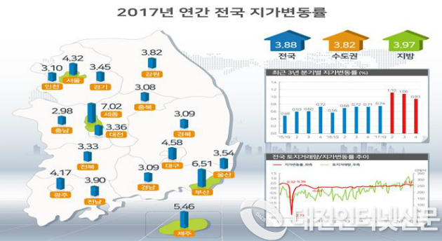 17개 시‧도의 땅값이 전반적으로 상승한 가운데 세종, 부산, 제주, 대구, 서울 순으로 높게 상승하였다.