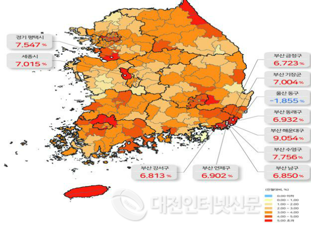 (7.55), 세종시(7.01), 부산 기장군(7.00)이 높은 상승률을 보였으며, 울산 동구(-1.86), 경남 거제시(0.33), 전북 군산시(1.17), 경기 연천군(1.50), 경기 동두천시(1.66)는 상대적으로 낮은 상승률을 보였다.
