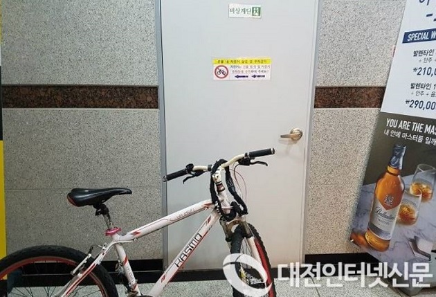 ▲ 비상계단에 자전거등을 놓아두면 안된다.