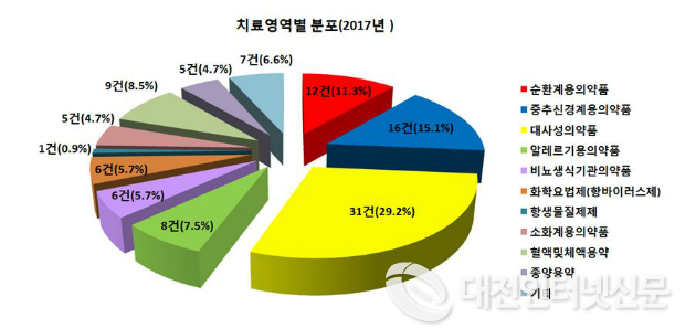 치료영역별로는 노인 인구 증가로 인한 당뇨병치료제 등 대사성의약품(31건, 29.2%), 치매 등에 사용하는 중추신경계용의약품(16건, 15.1%), 고혈압치료제 등 순환계용의약품(12건, 11.3%) 순으로 개발이 활발하게 이루어지는 것으로 나타났다.