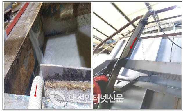 | ▲ 폐수 원액 저장조(집수조)와 임시배관 ▲집수조에 연결된 임시배관 추적 |