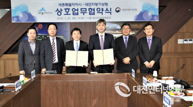 세종특별자치시 시민안전국(국장 장만희)과 대전지방기상청(청장 서장원)이 20일 오후 세종시청 6층 재난안전대책본부 회의실에서 세종시 안전정책과장, 안전기획담당, 안전상황실장 및 기상청 예보과장, 관측과장 등이 참석한 가운데 양 기관의 상호업무 협약식을 체결하였다.