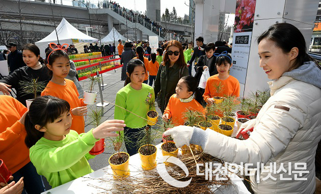 산림청이 73회 식목일을 앞두고 23일 서울 중구 7017 만리동광장에서 어린이들에게 소나무 묘목을 나눠주고 있다.<사진=산림청 제공>