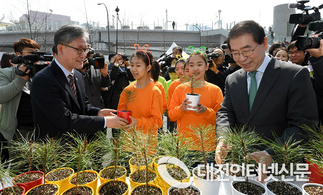 김재현 산림청장(왼쪽)과 박원순 서울시장이 73회 식목일을 앞두고 23일 서울 중구 7017 만리동광장에서 어린이들에게 소나무 묘목을 나눠주고 있다.