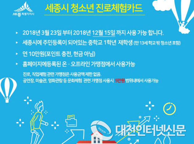 세종특별자치시(시장 이춘희)가 2018년 청소년 진로체험카드 지원사업을 확정하고 시행에 들어간다.