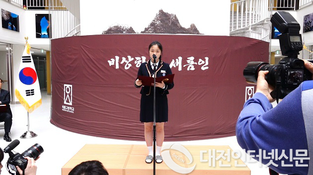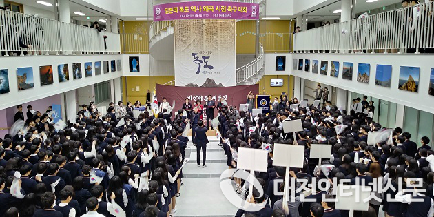새롬고등학교(교장 윤재국, 이하 새롬고)는 4일 학교 내에 위치한 세종시 독도전시관 앞에서 「일본의 독도 역사왜곡 시정 촉구 대회」를 개최했다.