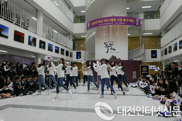 학생 대표의 성명발표로 시작된 이날 촉구 대회는 ▲전교생 항의 구호 낭독 ▲댄스 동아리의 독도 플래시몹 등 학생들이 주축이 되어 참여형 행사로 이뤄졌다.