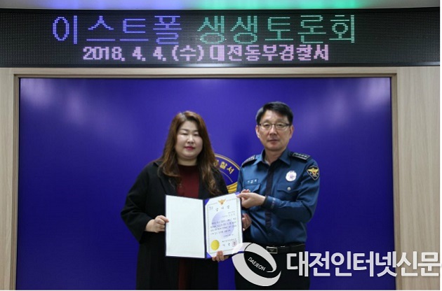 대전동부경찰서 (서장 서정권)는 `2018. 4. 4.(수) 09:00, 경찰서 중회의실(3층)에서 신속한 신고로 전화사기를 예방하는데 결정적인 도움을 준 김은영(46세,여)씨에게 경찰서장 감사장을 전달하였다.