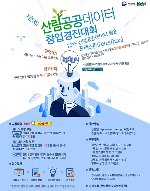 산림청(청장 김재현)은 오는 9일부터 6월 24일까지 ‘2018년 산림공공데이터 활용 창업경진대회(포레스톤 대회)’를 위한 아이디어를 공모한다고 6일 밝혔다.