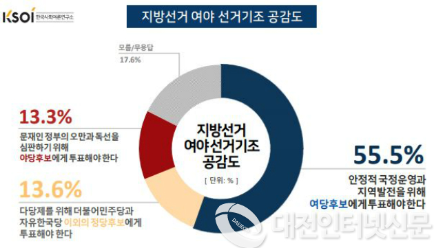 특히 지방선거 여야 선거기조 공감도에서 안정적 국정운영과 지역발전을 위해 여당후보에게 투표해야한다가 55.5%(세종·대전·충청 49.4%)로 2위 다당제를 위해 자유한국당 이외의 정당후보에게 투표해야한다 13.6%(세종·대전·충청 13.0%)를 크게 앞선 것으로 나타났으며 이밖에 문재인정부의 오만과 독선을 심판하기 위해 야당후보에게 투표해야한다가 13.3% 모름 또는 무응답이 17.6%를 차지하였다.