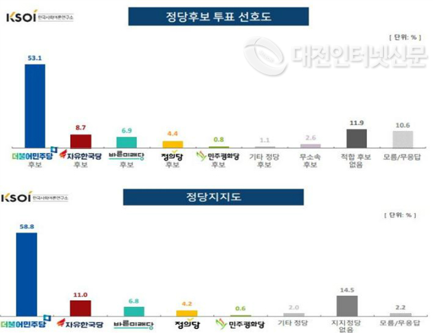 한국사회여론연구소(KSOI 대표 권수정)에 따르면 지난 전국 만 19세 이상 성인 남녀(세종,대전,충청 조사완료자 98명)를 대상으로 4월 28일부터 29일 양일간 진행된 구조화된 설문지를 이용한 전화면접조사(CATT 유무선 병행조사)에서 더불어민주당 정당지지도가 58.8%(2위 자유한국당 11.0%), 정당후보지지도(53.1%)에서도 2위 자유한국당(8.7%)을 큰 차이로 앞서고 있는 것으로 나타났다.