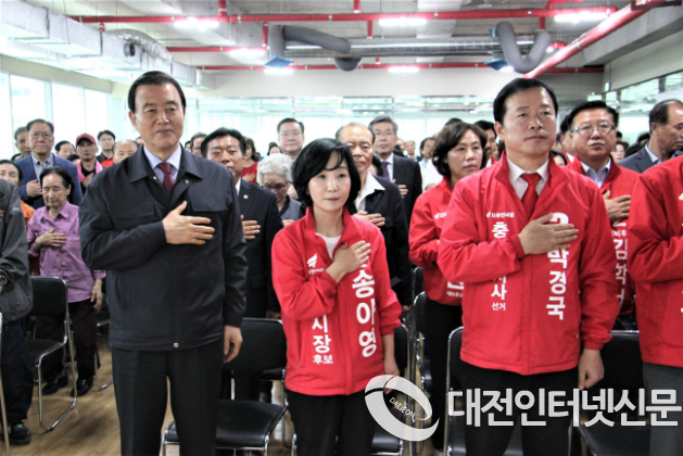 축사에 나선 홍문표 사무총장은 "이번 선거는 문재인 정권을 심판하는 선거로써 살림이 팍팍해졌고, 물가는 올랐으며, 최저임금 인상으로 소상공인들은 직격탄을 "남북 또는 북미회담의 성공적 개최를 희망하는 한편 북한의 의도에 끌려가는 듯한 상황에 대해서는 경계심을 풀어서는 안 된다"고 강조하고 중앙당이 "도덕과 능력을 엄선해 공천한 송 후보 지지를 호소하였다.