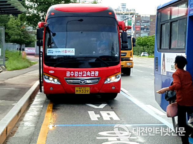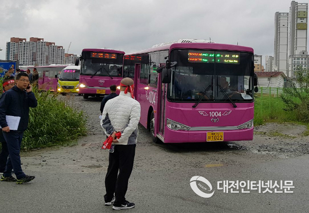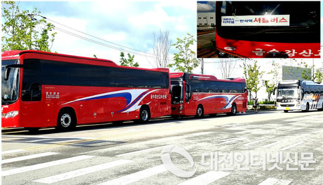 | 대전 반석역에 투입된 관광버스가 세종시로 출근을 지원하기 위해 대기하고 있다. [사진-대전인터넷신문] |
