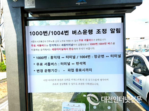 | 세종도시교통공사가 노조원들의 파업에 대비한 비상운행대책과 이용방법을 게시하고.. [사진-대전인터넷신문] |