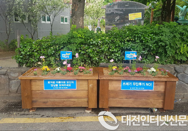 | ▲23일 유성구 온천1동이 쓰레기 무단투기 근절을 위해방죽공원에 꽃 화분을 설치했다. |