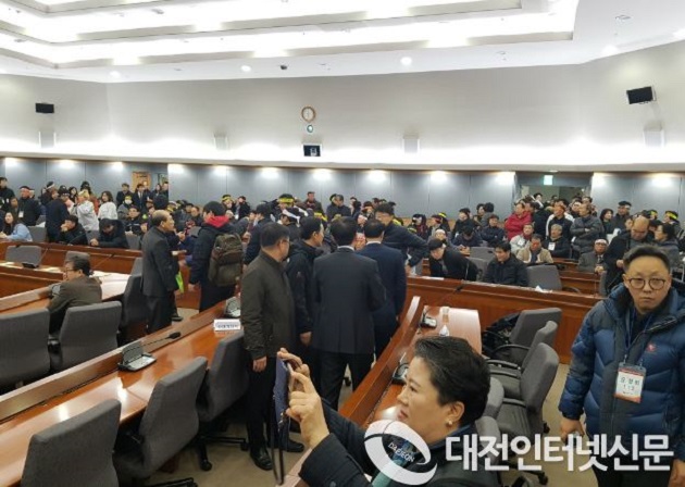 지난 2월 28일 정부서울청사에서 개최된 세종시이전 공청회장에서 대안 없는 이전을 반대하는 과천시민들... 세종시의회 의원 가운데 유일하게 참석한 정준이 의원이 성난 과천시민들의 폭력사태를 유심히 관찰하는 모습도... [사진-대전인터넷신문] |