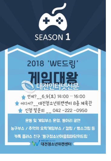 대전청소년위캔센터(관장 권부남)에서는 6월 9일(토) 오후 2시부터 대전청소년위캔센터 8층 체육관에서 2018 대전동구청소년어울림마당 2회차 `게임대왕´을 진행할 예정이다.