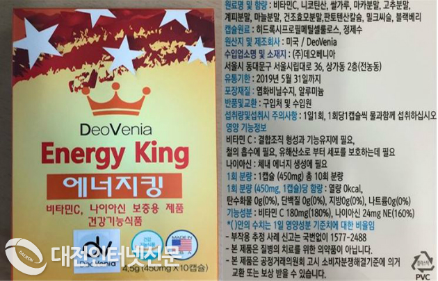 식품의약품안전처(처장 류영진)는 식품수입판매업체 ㈜ 데오베니아(서울시 동대문구 소재)가 수입·판매한 건강기능식품 `에너지킹´(비타민C, 나이아신 보충용) 제품에서 발기부전치료제인 타다라필이 78 mg/kg 검출(기준: 불검출)되어 유통기한이 2019년 5월 31일인 제품에 한해 판매중단 및 회수조치 한다고 밝혔다. 전체 수입량은 22(kg)인 것으로 조사되었다