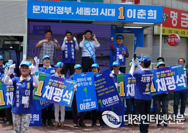 도농복합도시 세종시 부강면 5일장이 열린 10일 오후 12시 30분 장터 한가운데에서 열린 더불어민주당 합동유세에서 이춘희 세종시장 후보는 이 자리에 모인 유권자들을 향해 전국투표율 1위를 위한 선거에 참여할 것을 당부하고 부강면 대표로 지방선거에 출마한 채평석 후보를 지지해줄 것을 간곡히 당부하였다.