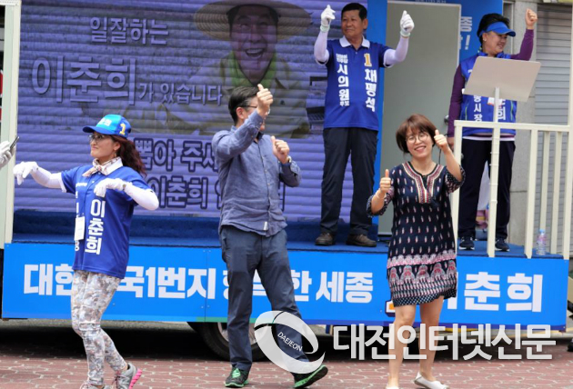이 후보의 지원 유세장에 흘러나오는 선거로고송에 맞춰 주민들은 즉흥적으로 춤을 추며 유세장을 신명나는 유세장으로 바꾸고 이춘희, 채평석을 번갈아 부르며 지지를 보냈다.