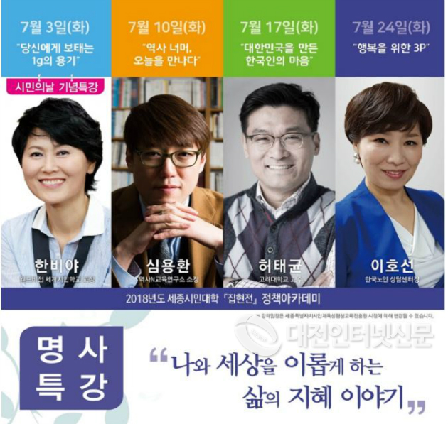 세종특별자치시(시장 이춘희)는 7월 3일부터 7월 24일까지`명사초청 특강´으로 정책아카데미를 운영한다.