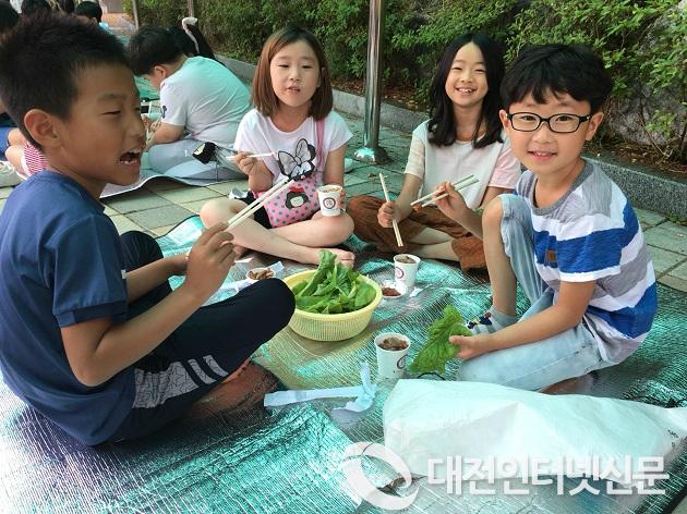 ▲ 부강초가 학생들이 교내 텃밭에서 직접 재배한 작물을 수확하고 친구와 교사, 학부모와 삼겹살을 먹으며 행복을 나누는 텃밭 갈무리 잔치를 열었다. 사진은 학생들이 텃밭 갈무리 행사에서 텃밭에서 재배한 작물과 함께 식사를 즐기는 장면(사진제공-세종시교육청)