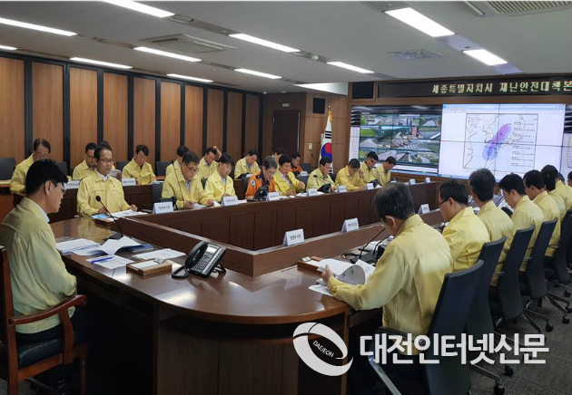 이춘희 세종시장이 3일 오전 재난안전대책본부에서 긴급회의를 갖고, 간부 직원 40여명과 함께 호우피해 및 조치현황, 태풍의 이동경로와 앞으로의 대비 사항을 긴급 점검했다.