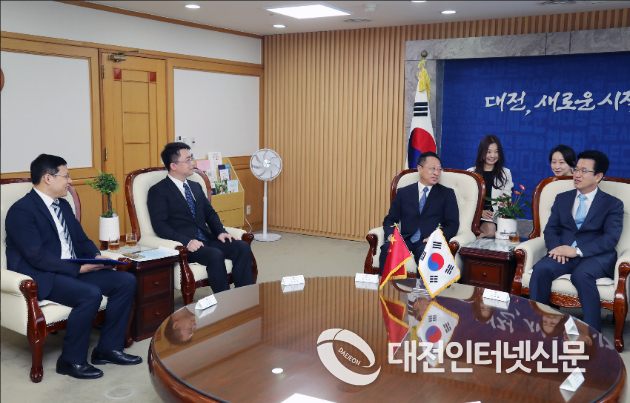 허태정 대전시장은 17일 오전 중국 랴오닝성(辽宁省) 성 소재지이자 동북방 지역의 중심도시인 선양시의 대표단(단장 왕징잉)을 대전시청에서 직접 접견하고, 양도시간 우호협력 확대방안에 대해 논의했다.
