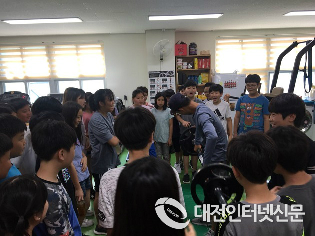 ▲ 학생들이 학교시설 탐방 중 레슬링장을 방문해 운동기구에 대한 설명을 들으며 즐거워하고 있다.(세종시교육청제공)