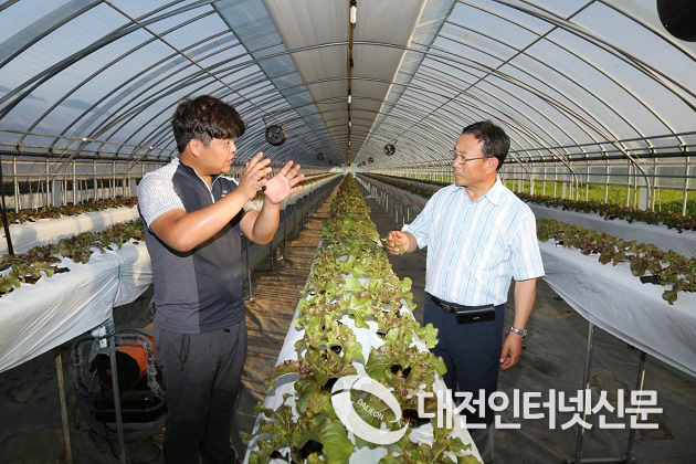 | ▲ 청년귀농인 정승원(좌)와 금산군농업기술센터 황경록 기술보급과장(우)이 상추하우스 현장에서 재배기술을 상의하고 있는 모습.(사진제공-금산군청)