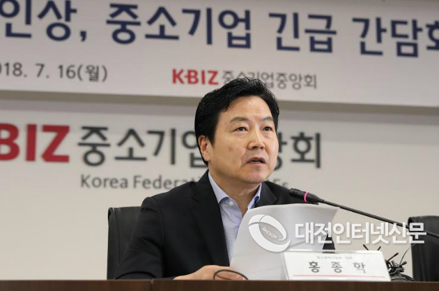 홍종학 장관이 지난16일 중소기업중앙회를 찾아 중소기업인들과 간담회를 갖고 최저임금 인상에 따른 기업 경영현장의 어려움을 청취하고 있다. [사진-중소벤처기업부]