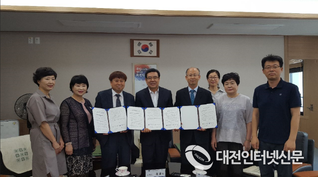 | ▲ 중앙 정 가운데 동부교육지원청 최경노 교육장님, 교육장 오른쪽은 대전충남생명의숲 상임대표 김종원, 왼쪽은 대전청소년상담복지센터 소장 이덕기, 그외는 동부교육지원청과 협약기관 관계자들이다.사진제공-대전동부교육지원청 |