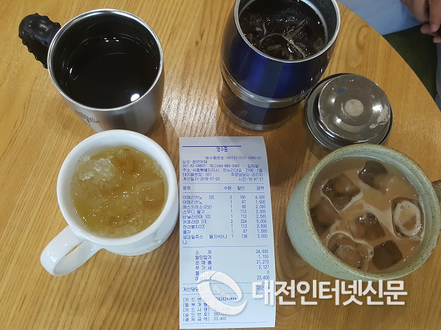 | ▲ `꿈앤카페´에서 음료 구입 시 다회용컵을 사용하는 고객에게 100원을 할인해주는 캠페인도 실시장면(사진-세종시청) |