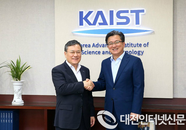 ▲지난 2일 정용래 대전 유성구청장이 카이스트를 방문해 신성철 총장과 간담회를 갖고 기념촬영을 하고 있다.