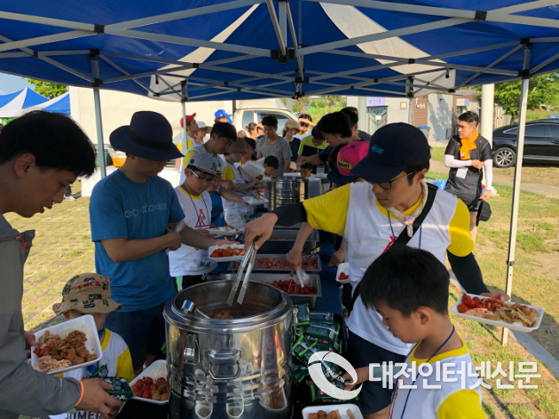 캠프 2일차 아침. 체육회가 마련한 아침식사를 하는 아이들과 아빠는 각자의 메뉴를 고르는 재미에...[사진-대전인터넷신문]