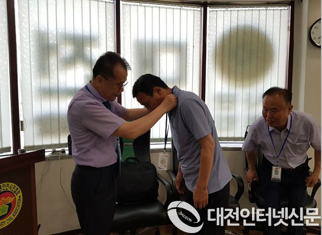 ▲ 사단법인 한국교통안전시민협회 교통안전홍보위원의 신분증을 직접 걸어주고 있는 이래희 이사장