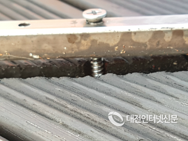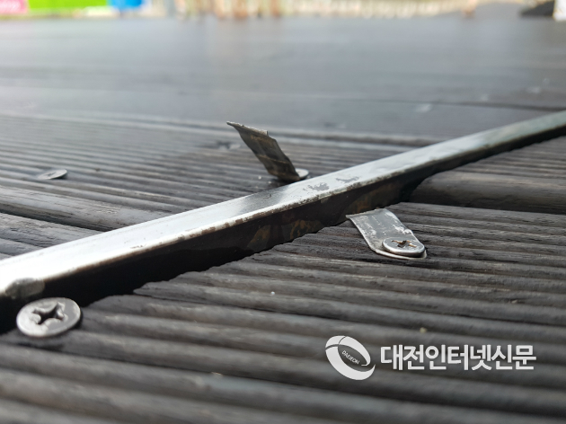 보행자 데크로 돌출된 날카로운 철판이 그대로 방치되고 있다. [사진-대전인터넷신문]