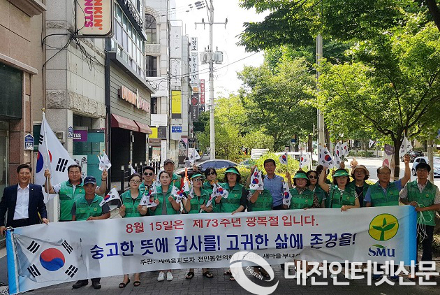 | ▲제73주년 광복절을 하루 앞둔 14일 오후 전민동 새마을협의회 회원들이 전민네거리에서 나라사랑 태극기 달기 가두 캠페인을 펼치고 있다. |