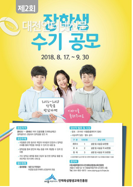 (재)세종특별자치시 인재육성평생교육진흥원(이사장 이춘희)이 지난 2012년 이래 선발돼 장학금 수혜를 받은 장학생을 대상으로 `제2회 장학생 수기 공모전´을 개최한다.