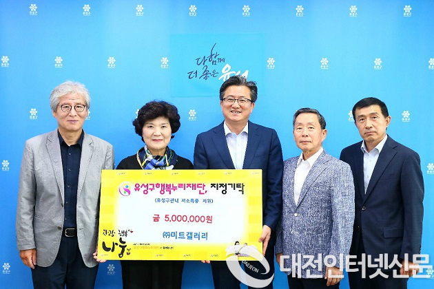대전 유성구(구청장 정용래)는 21일 ㈜미트갤러리(대표 송정숙)가 유성구행복누리재단에 후원금 500만원을 기탁했다고 밝혔다.
