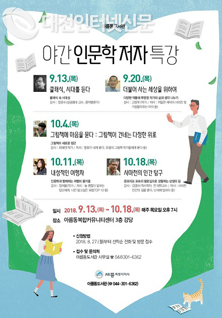 신현장 아름동장은 “이번 야간 인문학 저자특강은 깊어가는 가을밤 독서와 사색의 의미를 되새기는 소중한 기회가 될 것”이라며 “보다 많은 시민들이 참석해 시민들이 저자로부터 책의 내용과 집필의도 등을 들으며 세상을 읽고 소통하는 계기가 되길 바란다”고 말했다.