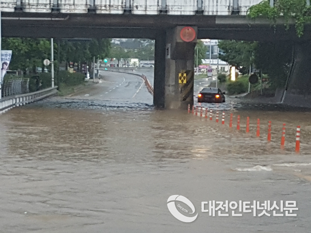 유성에서 현충원 방면으로, 유성톨게이트 진입전 도로가 침수. 차량이 고립되있고 이로인해 전면통제되고 있다. [사진-대전인터넷신문]